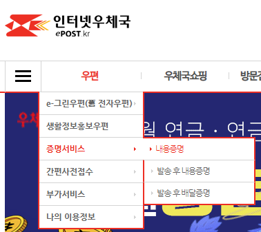 그리고 인터넷우체국 홈페이지의 우편 > 증명서비스 > 내용증명 페이지를 선택합니다.